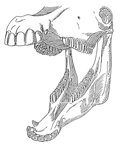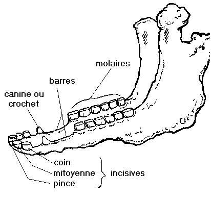 Les dents sont réparties de cette manière sur chaque demi-mâchoire : 3 incisives, 1 canine et 6 molaires, la zone sans dents est appelée «barre», c’est à cet endroit que repose le mors. Les juments n’ont généralement pas de crochets, sinon elles sont dites «bréhaigne».